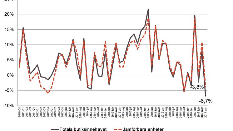 En bidragande orsak till nedgången i april tillskrivs det kalla vädret samt att påsken i år inföll i april jämfört med mars förra året, vilket inneburit tre färre försäljningsdagar i år.