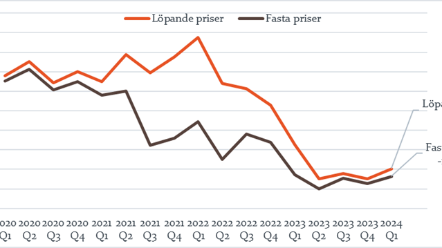 Försäljningen till proffskunderna stod länge emot nedgången men har fallit sedan årsskiftet 2022/2023. Under första kvartalet 2024 föll B2B-försäljningen med 19,5 procent, mätt i fasta priser medan vi kan konstatera ett trendbrott för B2C-försäljning som landade på en måttligare nedgång om 7,9 procent efter dryga två år med tvåsiffriga nedgångar. Noterbart är också att kvartalets sista månad visade på en än större skillnad.