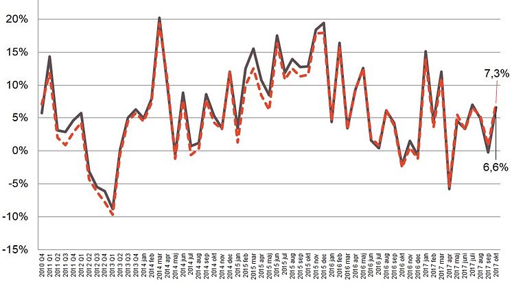Bygg- och järnindex från branschorganisationen Byggmaterialhandlarna visar att försäljningen mätt på jämförbara enheter och i löpande priser ökade med 7,3 procent i oktober.
