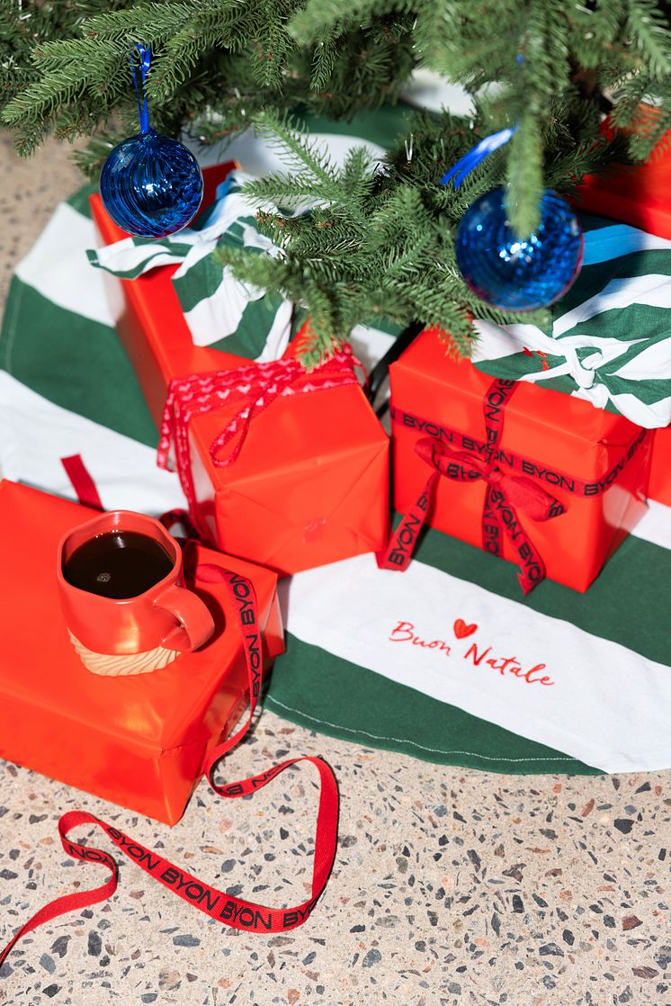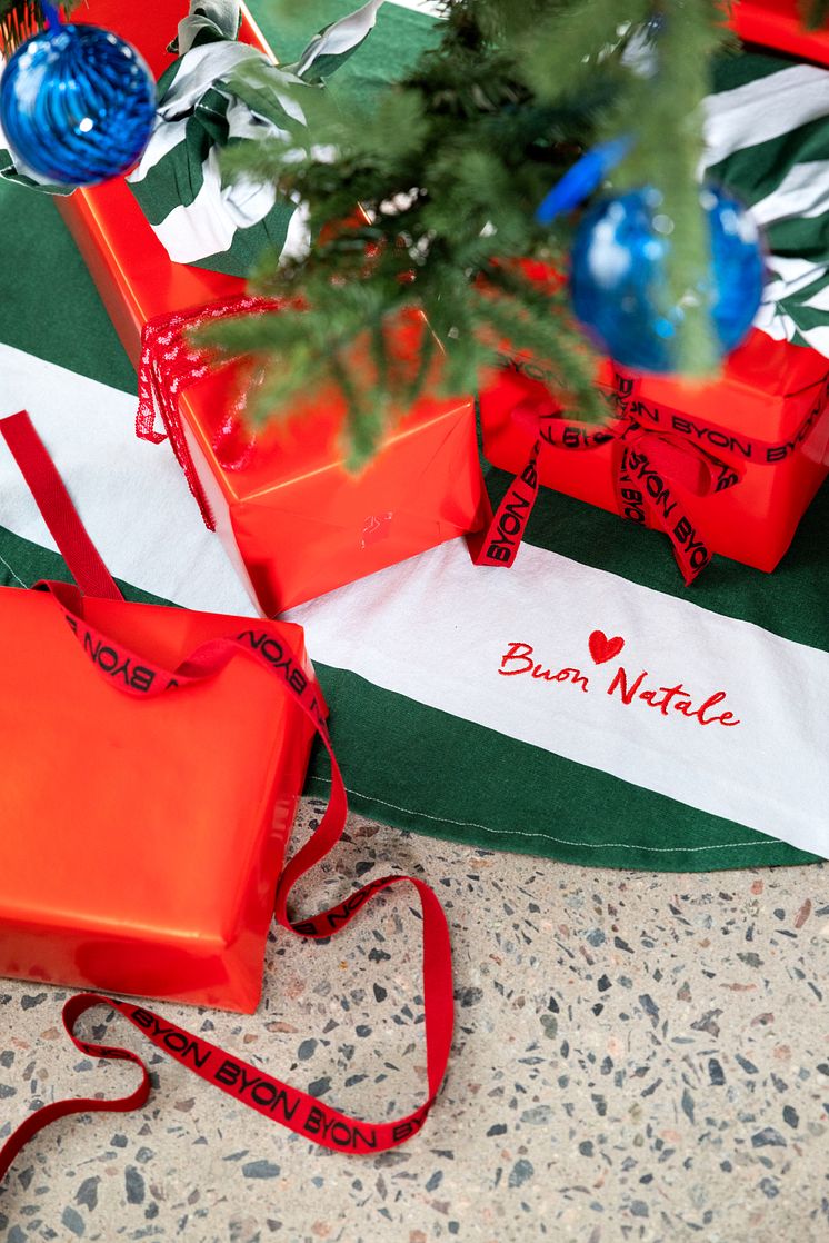 Julgransmattan "Love" ger stil och elegans till din högtid och ramar in granen på ett sofistikerat sätt. Med ikoniska ränder och ett broderat "Buon Natale"-budskap, finns mattan i färgkombinationerna smörgul/röd och grön/ljusblå. Mattan matchar "Love"-serien som även innehåller dukar, servetter och handdukar. Tillverkad av 100% certifierad ekologisk bomull, är den även idealisk som en dekorativ matta för mindre runda bord.