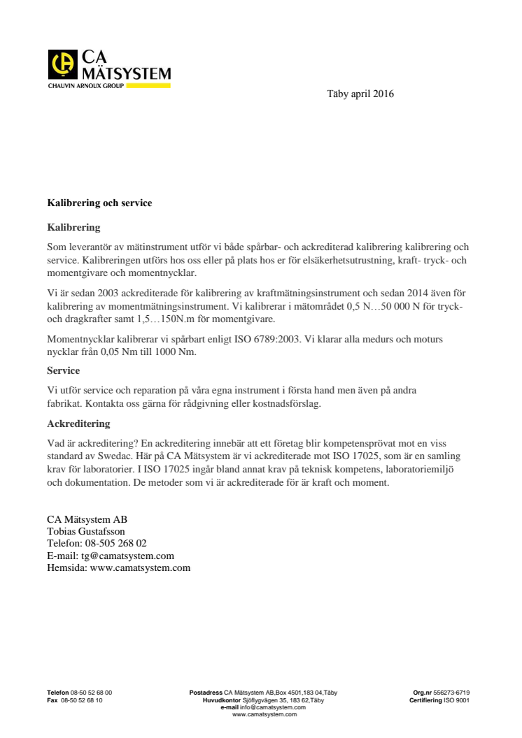 Som leverantör av mätinstrument utför vi både spårbar- och ackrediterad kalibrering kalibrering och service. Kalibreringen utförs hos oss eller på plats hos er för elsäkerhetsutrustning, kraft- tryck- och momentgivare och momentnycklar.