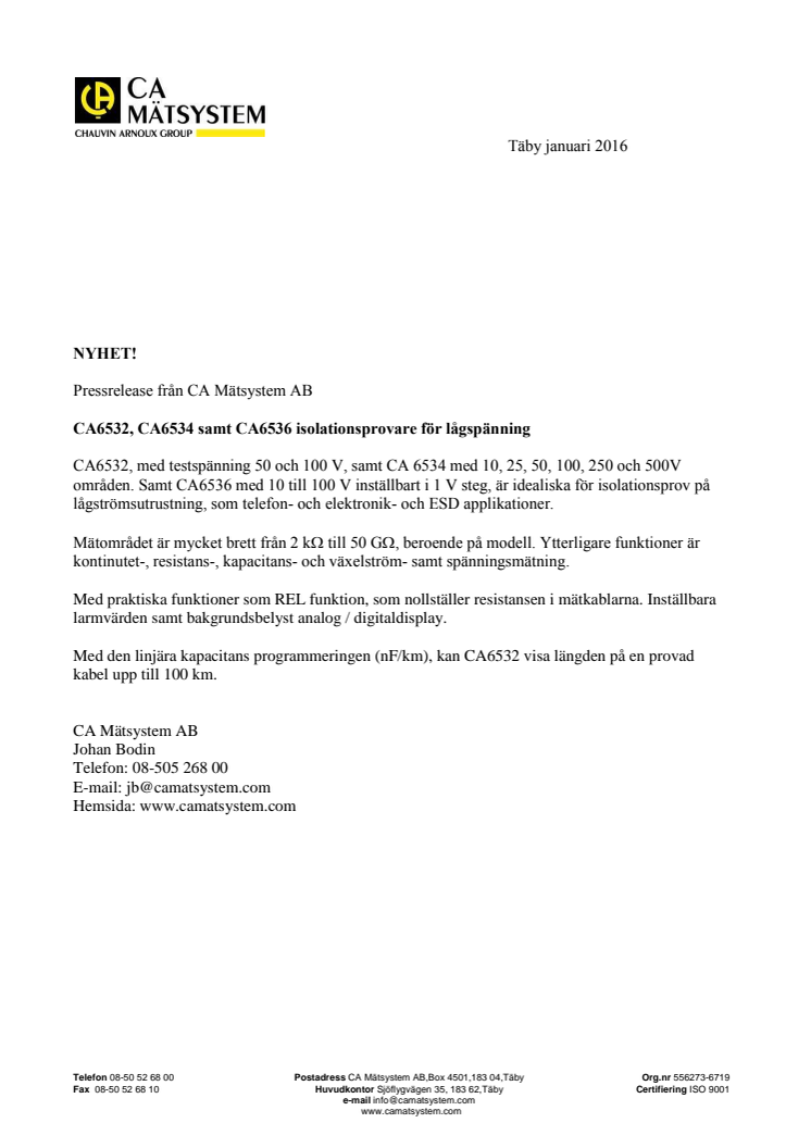 Chauvin-Arnoux är ett franskt familjeföretag som tillverkar mätinstrument i 7 egna fabriker sedan 1893. CA Mätsystem är ett dotterbolag för den nordiska marknaden. Våra varumärken är Chauvin-Arnoux, Metrix, Enerdis, Pyro-Côntrole och Multimetrix. Naturligtvis är vi ISO9001 och ISO14001 certifierade. Internationellt är vi ett världsomspännande nätverk av 10 dotterbolag med 1000 anställda. Se mer på vår hemsida www.chauvin-arnoux.se