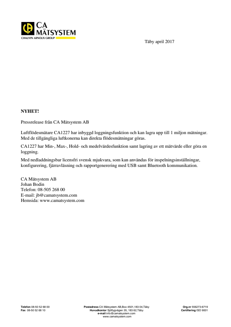 CA1227 har Min-, Max-, Hold- och medelvärdesfunktion samt lagring av ett mätvärde eller göra en loggning.
