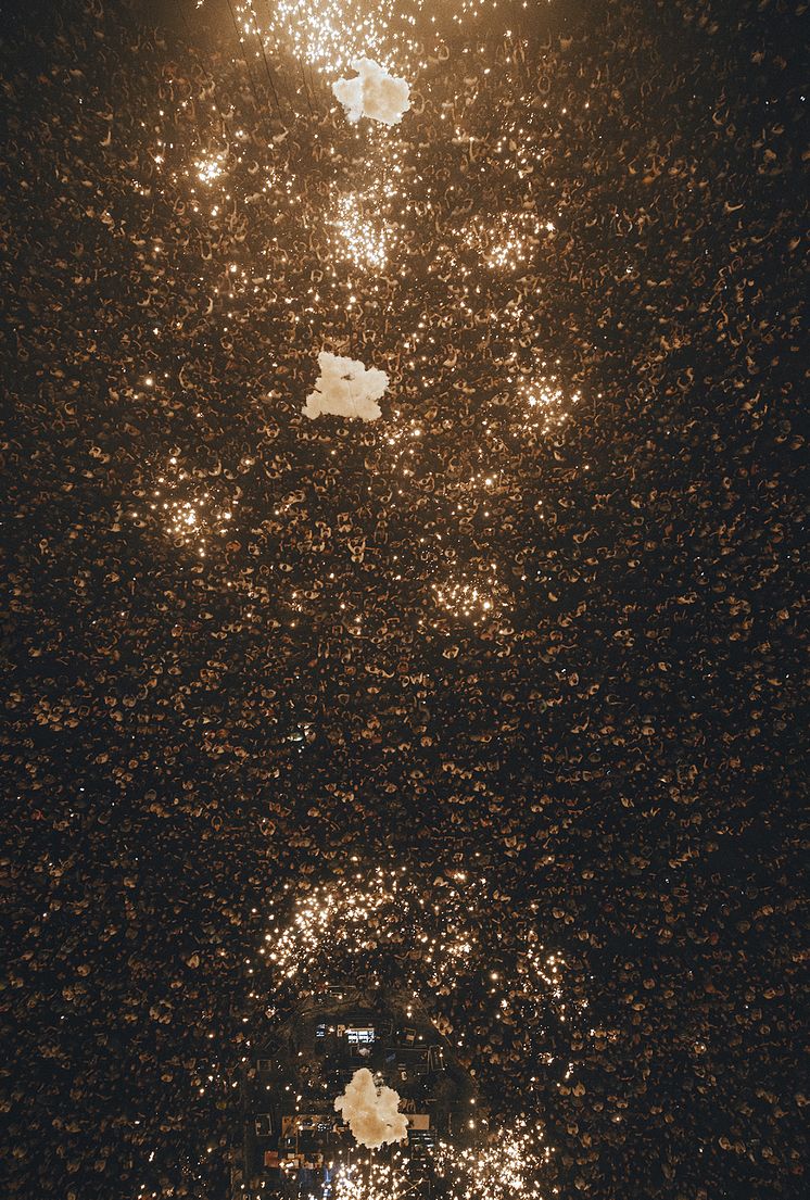 Positioner. Den kan vara kul (och läskigt) att fota från en annorlunda position. Se dig omkring – kanske kan du hitta en plats med en helt annan vinkel. För att ta den här bilden så tittade jag upp och begav mig 50 meter uppåt för att kunna fota rakt ner. Jag timade det precis med ett fyrverkeri som brändes av under mig. Det gav bilden en väldigt speciell känsla och det känns som att man kan titta på bilden väldigt länge och hitta nya saker hela tiden. – Jag älskar den typen av bilder, men det var sjukt läskigt att vara där uppe…. Just denna vinkel kan vara svår att få till men kanske det finns en bar eller restaurang i närheten med ett annorlunda perspektiv? Kolla vid trappan till utgången, bakom ett träd – var kreativ. Massor av platser är mycket bättre att stå på än precis framför scenen.