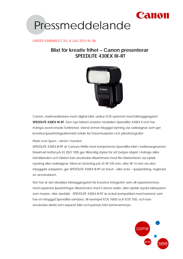 Canon, marknadsledare inom digital bild, utökar EOS-systemet med blixtaggregatet SPEEDLITE 430EX III-RT. Den nya blixten ersätter modellen Speedlite 430EX II och har många avancerade funktioner, bland annat inbyggd styrning via radiosignal, som ger kreativa ljussättningsalternativ både för fotoentusiaster och yrkesfotografer.