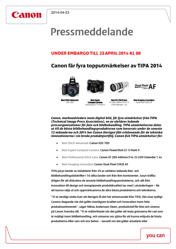 Canon, marknadsledare inom digital bild, får fyra utmärkelser från TIPA (Technical Image Press Association), en av världens ledande pressorganisationer för foto och bildbehandling. TIPA-utmärkelserna delas ut till de bästa bildbehandlingsprodukterna som lanserats under de senaste 12 månaderna och 2014 har Canon återigen fått erkännande för de tekniska innovationerna i sin breda produktportfölj.