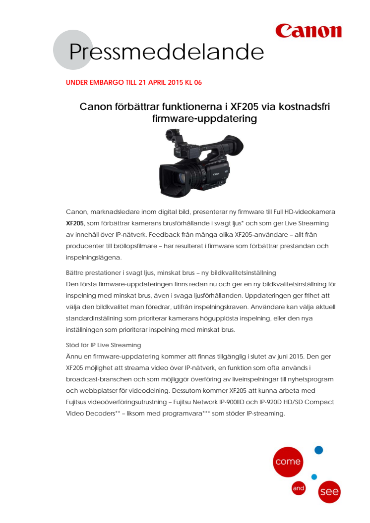 Canon, marknadsledare inom digital bild, presenterar ny firmware till Full HD videokamera XF205, som förbättrar kamerans brusförhållande i svagt ljus* och som ger Live Streaming av innehåll över IP-nätverk. Feedback från många olika XF205 användare – allt från producenter till bröllopsfilmare – har resulterat i firmware som förbättrar prestandan och inspelningslägena.