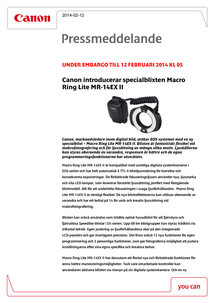 Canon, marknadsledare inom digital bild, utökar EOS-systemet med en ny specialblixt – Macro Ring Lite MR-14EX II. Blixten är fantastiskt flexibel vid makrofotografering och för ljussättning av många olika motiv. Ljuskällorna kan styras oberoende av varandra, responsen är bättre och de egna programmeringsfunktionerna har utvecklats.
