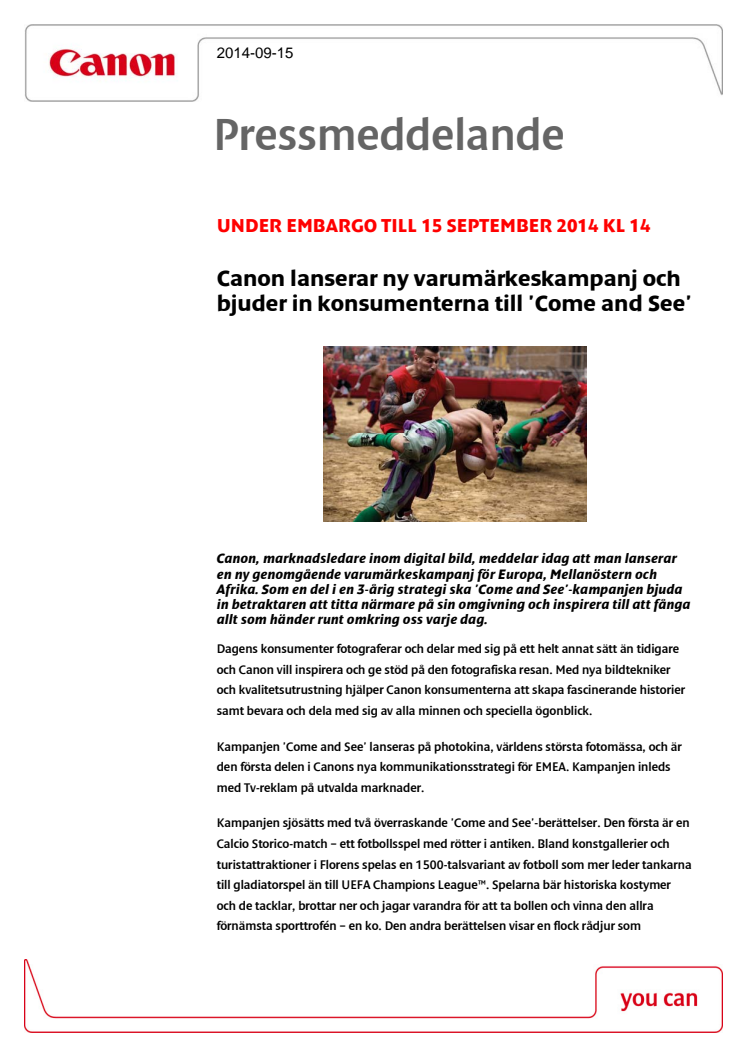 Canon, marknadsledare inom digital bild, meddelar idag att man lanserar en ny genomgående varumärkeskampanj för Europa, Mellanöstern och Afrika. Som en del i en 3-årig strategi ska 'Come and See'-kampanjen bjuda in betraktaren att titta närmare på sin omgivning och inspirera till att fånga allt som händer runt omkring oss varje dag.