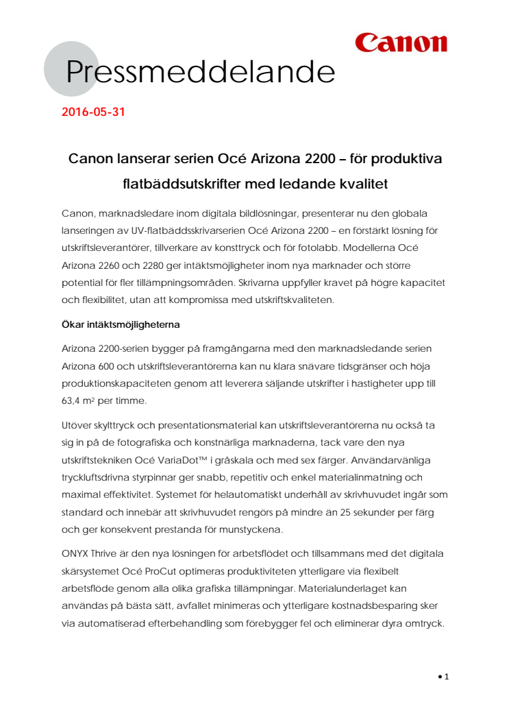 Canon lanserar nu globalt av UV-flatbäddsskrivarserien Océ Arizona 2200 – en förstärkt lösning för utskriftsleverantörer, tillverkare av konsttryck och för fotolabb. Océ Arizona 2260 och 2280 ger intäktsmöjligheter inom nya marknader och större potential för fler tillämpningsområden. Skrivarna uppfyller kravet på högre kapacitet och flexibilitet, utan att kompromissa med utskriftskvaliteten.