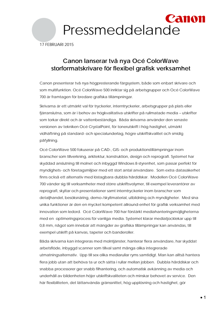 Canon presenterar två nya högpresterande färgsystem, både som enbart skrivare och som multifunktion. Océ ColorWave 500 inriktar sig på arbetsgrupper och Océ ColorWave 700 är framtagen för bredare grafiska tillämpningar.