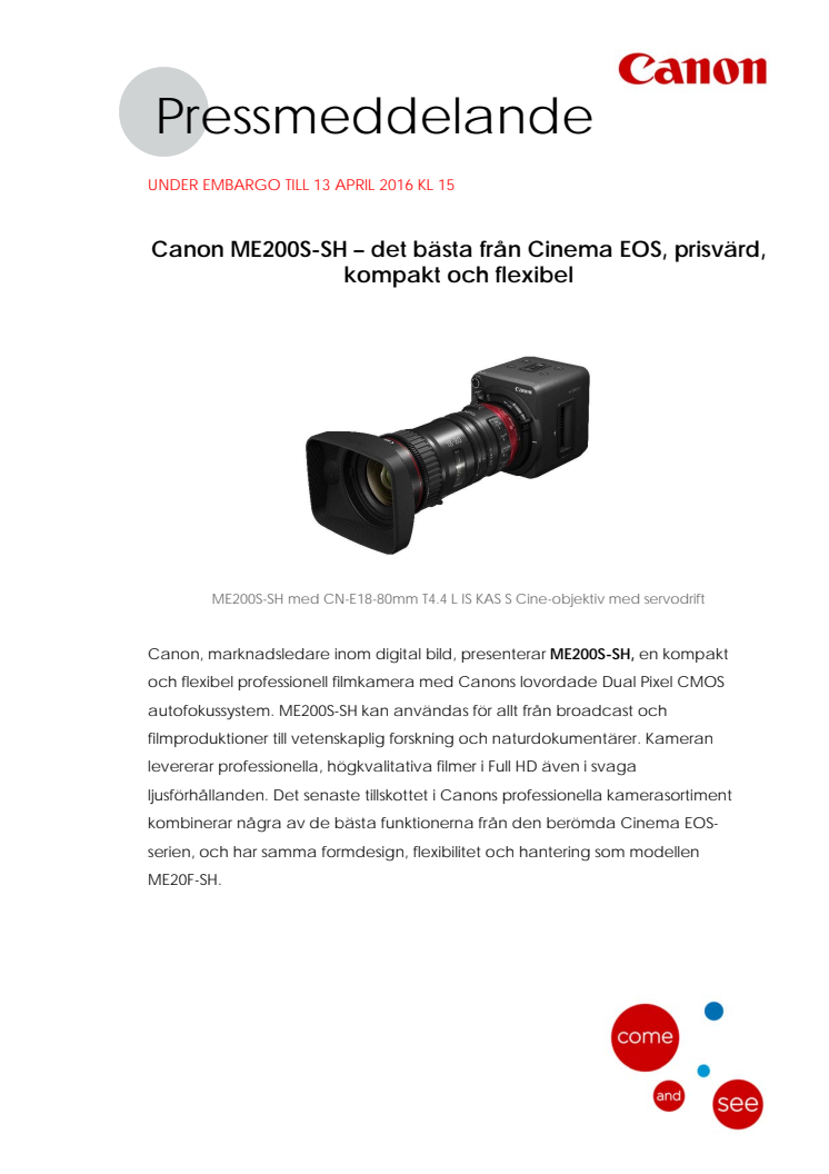 Canon, marknadsledare inom digital bild, presenterar ME200S-SH, en kompakt och flexibel professionell filmkamera med Canons lovordade Dual Pixel CMOS autofokussystem. ME200S-SH kan användas för allt från broadcast och filmproduktioner till vetenskaplig forskning och naturdokumentärer. Kameran levererar professionella, högkvalitativa filmer i Full HD även i svaga ljusförhållanden.