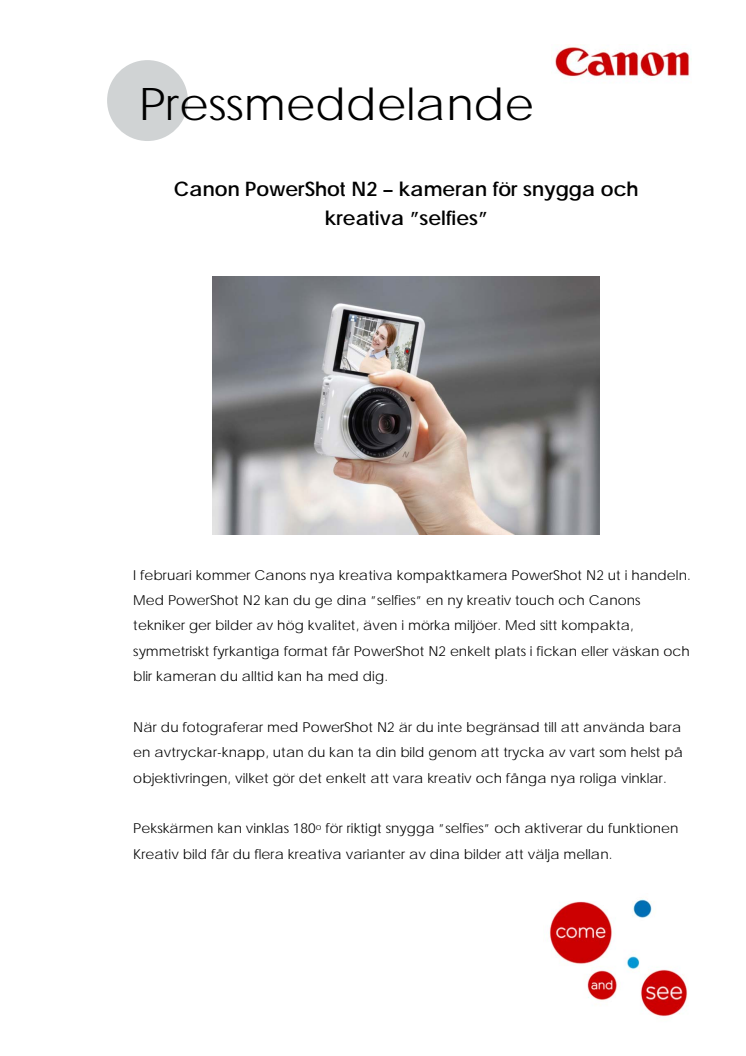 I februari kommer Canons nya kreativa kompaktkamera PowerShot N2 ut i handeln. Med PowerShot N2 kan du ge dina ”selfies” en ny kreativ touch och Canons tekniker ger bilder av hög kvalitet, även i mörka miljöer. Med sitt kompakta, symmetriskt fyrkantiga format får PowerShot N2 enkelt plats i fickan eller väskan och blir kameran du alltid kan ha med dig.