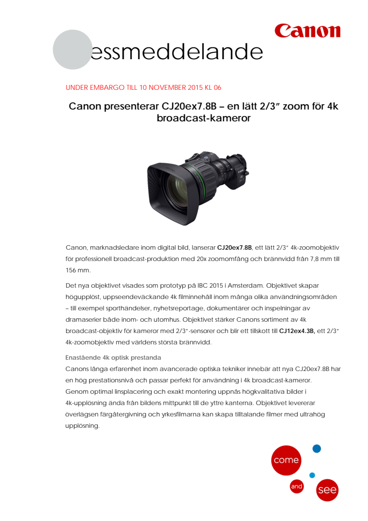 Canon, marknadsledare inom digital bild, lanserar CJ20ex7.8B, ett lätt 2/3” 4k-zoomobjektiv för professionell broadcast-produktion med 20x zoomomfång och brännvidd från 7,8 mm till 156 mm.
