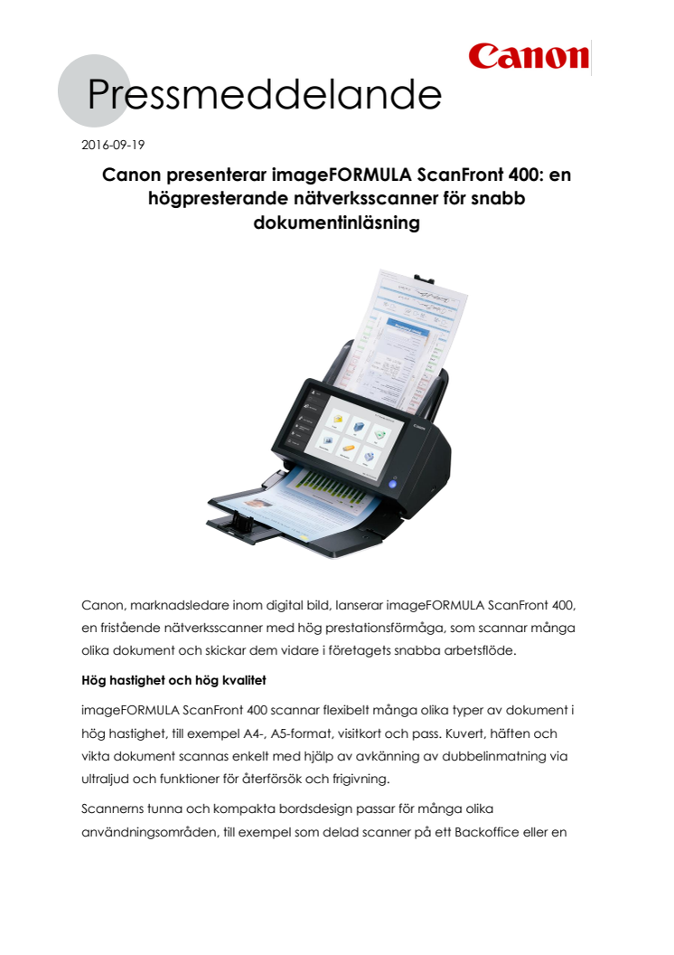 Canon, marknadsledare inom digital bild, lanserar imageFORMULA ScanFront 400, en fristående nätverksscanner med hög prestationsförmåga, som scannar många olika dokument och skickar dem vidare i företagets snabba arbetsflöde.