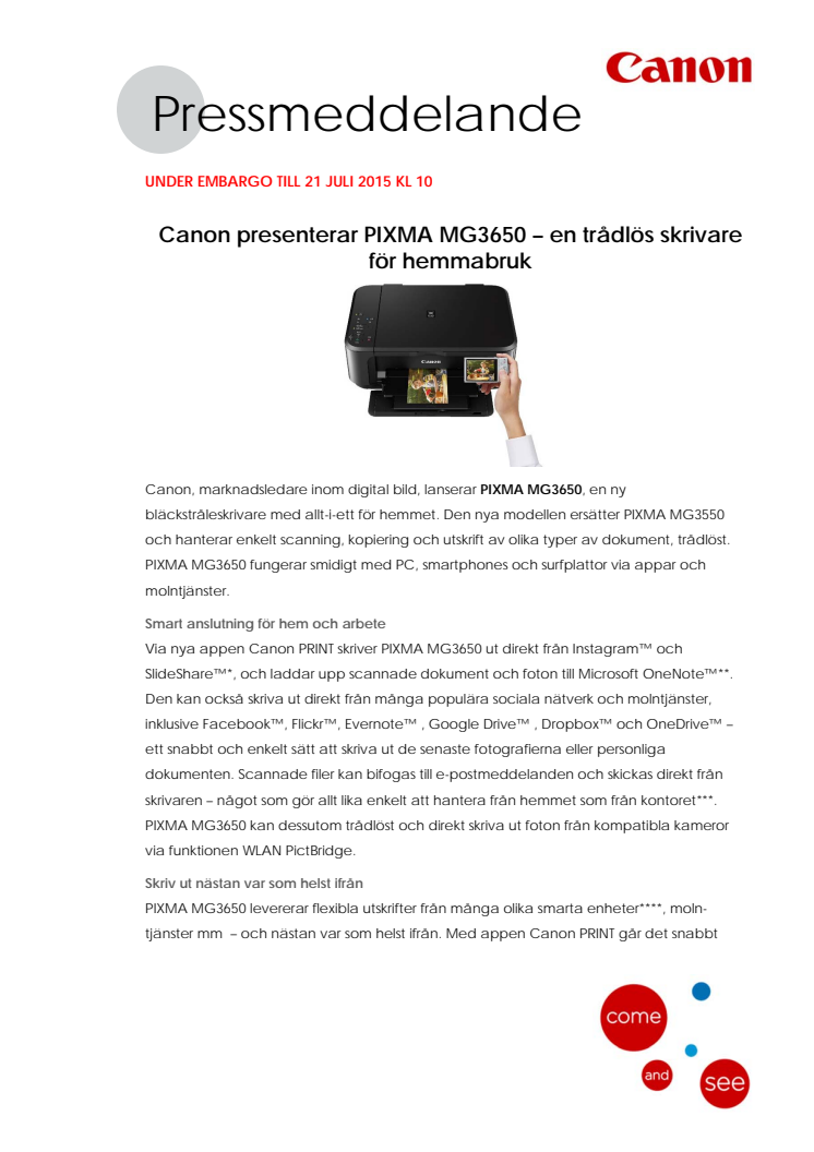 Canon, marknadsledare inom digital bild, lanserar PIXMA MG3650, en ny bläckstråleskrivare med allt-i-ett för hemmet. Den nya modellen ersätter PIXMA MG3550 och hanterar enkelt scanning, kopiering och utskrift av olika typer av dokument, trådlöst. PIXMA MG3650 fungerar smidigt med PC, smartphones och surfplattor via appar och molntjänster.