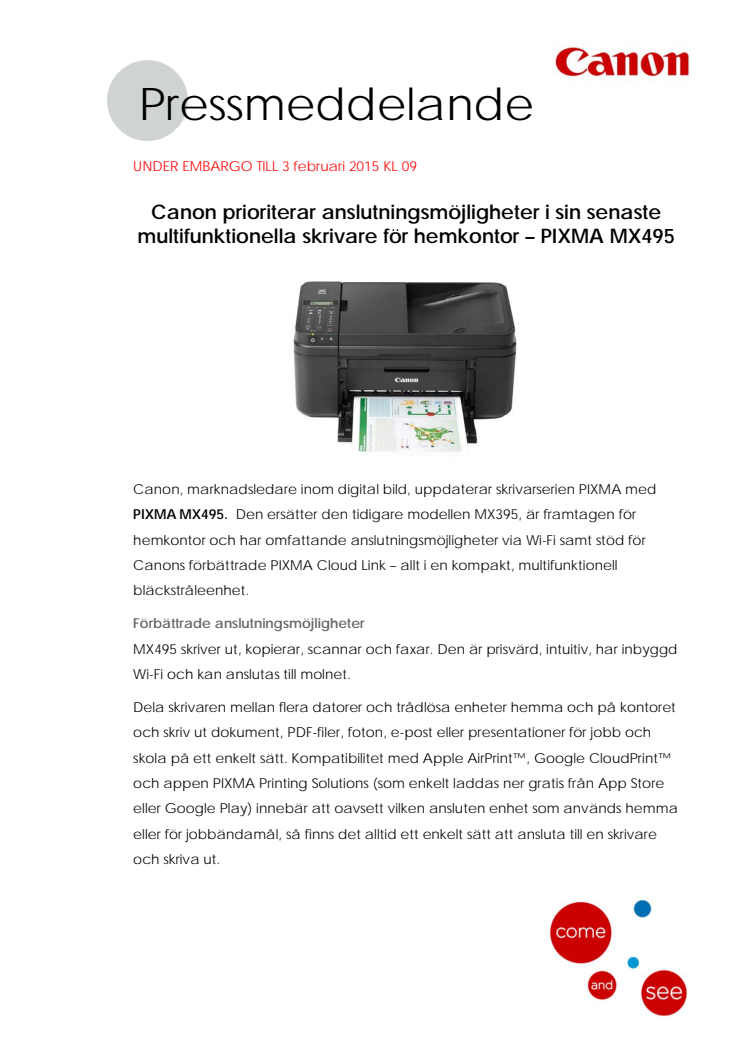Canon, marknadsledare inom digital bild, uppdaterar skrivarserien PIXMA med PIXMA MX495. Den ersätter den tidigare modellen MX395, är framtagen för hemkontor och har omfattande anslutningsmöjligheter via Wi-Fi samt stöd för Canons förbättrade PIXMA Cloud Link – allt i en kompakt, multifunktionell bläckstråleenhet.