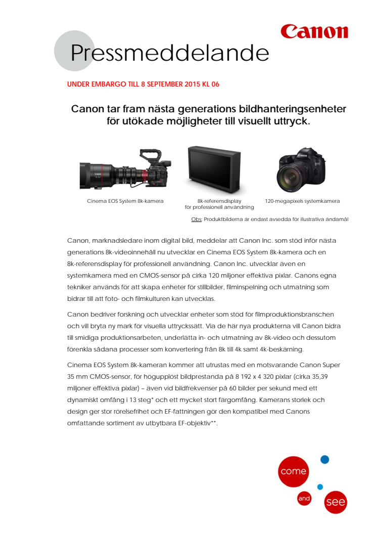 Canon, marknadsledare inom digital bild, meddelar att Canon Inc. som stöd inför nästa generations 8k-videoinnehåll nu utvecklar en Cinema EOS System 8k-kamera och en 8k referensdisplay för professionell användning. Canon Inc. utvecklar även en systemkamera med en CMOS sensor på cirka 120 miljoner effektiva pixlar.
