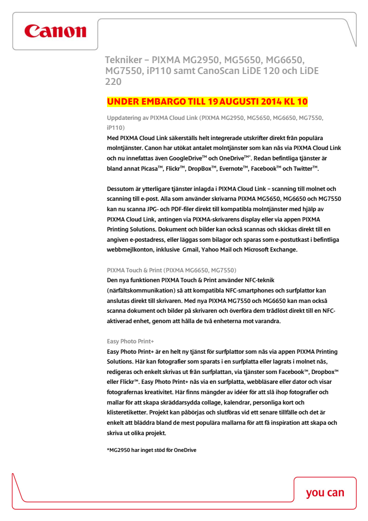 Canon Teknisk förklaring PIXMA MG7550, 6650, 5650, 2950, iP 110, Canon Scan LiDE 120, 220