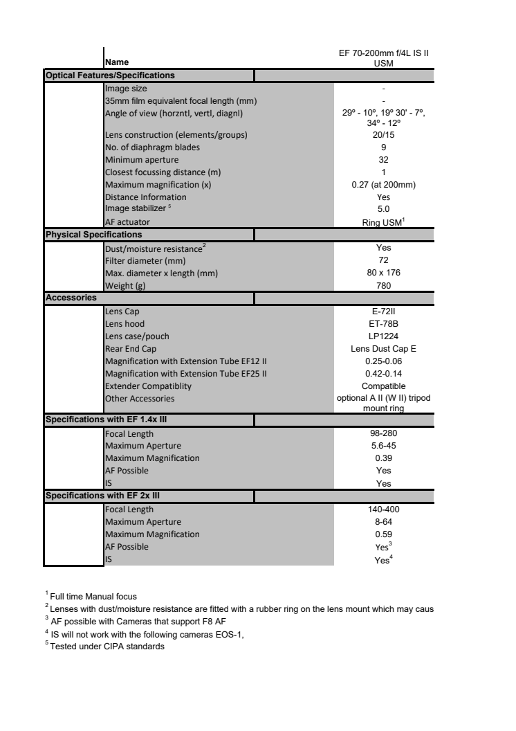 Canon Tekniska specifikationer EF 70-200mm f4L IS II USM