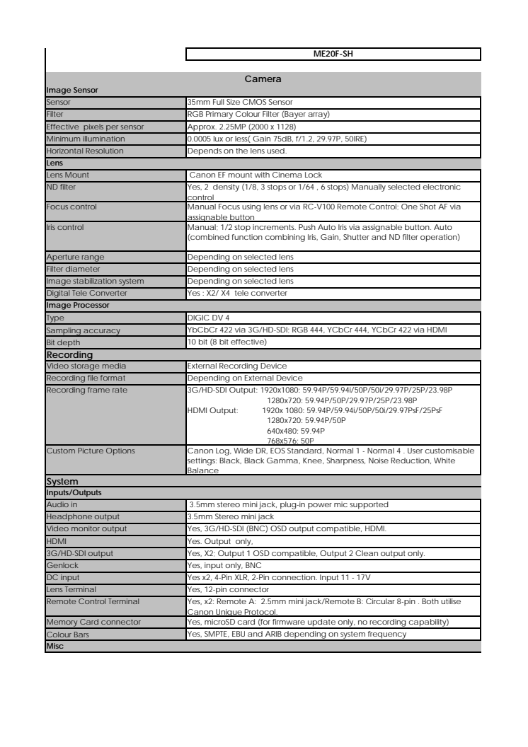 Canon Tekniska specifikationer ME20F-SH
