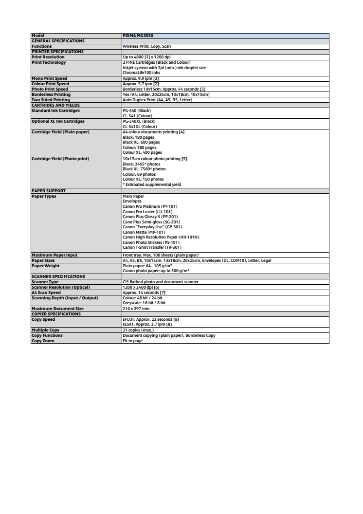 Canon Tekniska Specifikationer PIXMA MG3550