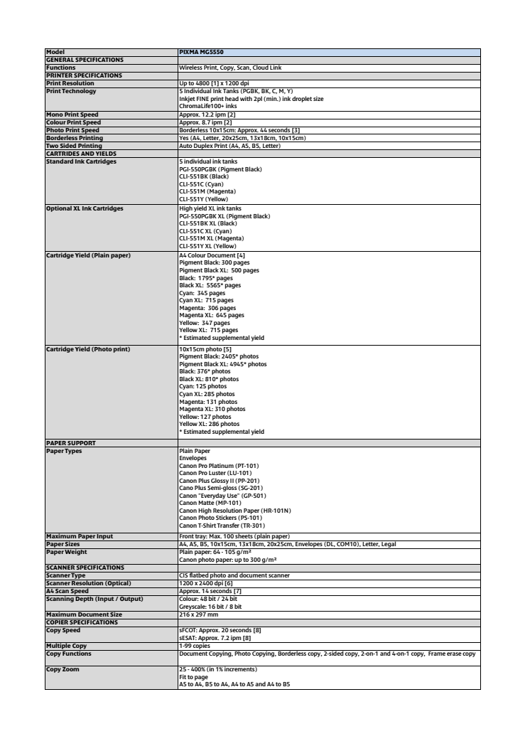 Canon Tekniska specifikationer PIXMA MG5550
