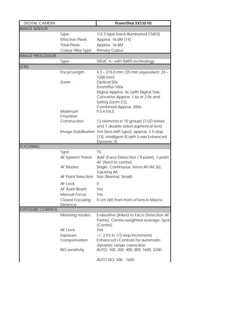 Canon Tekniska specifikationer PowerShot SX530 HS