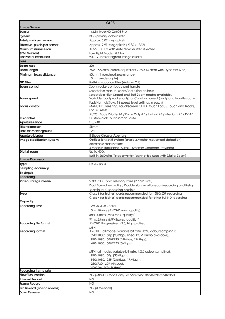 Canon Tekniska specifikationer XA35