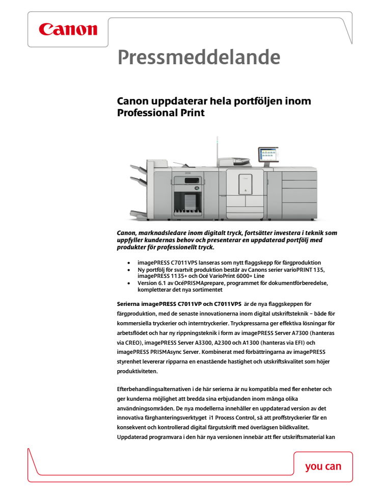Canon, marknadsledare inom digitalt tryck, fortsätter investera i teknik som uppfyller kundernas behov och presenterar en uppdaterad portfölj med produkter för professionellt tryck.