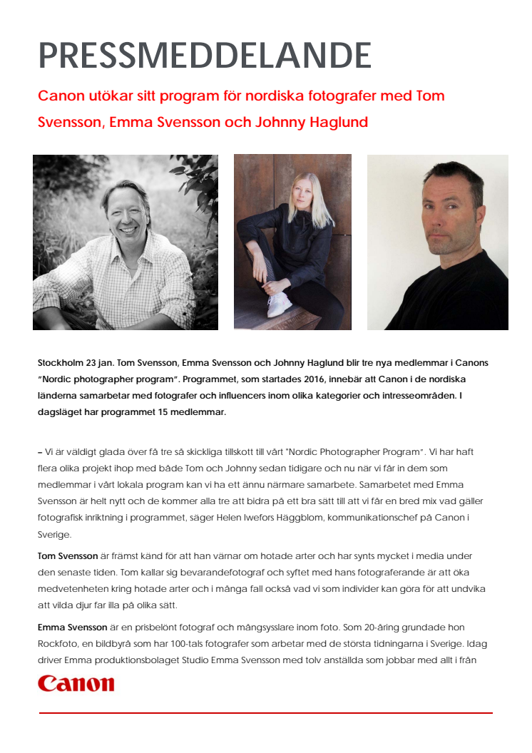 Tom Svensson, Emma Svensson och Johnny Haglund blir tre nya medlemmar i Canons ”Nordic photographer program”. Programmet, som startades 2016, innebär att Canon i de nordiska länderna samarbetar med fotografer och influencers inom olika kategorier och intresseområden. I dagsläget har programmet 15 medlemmar.