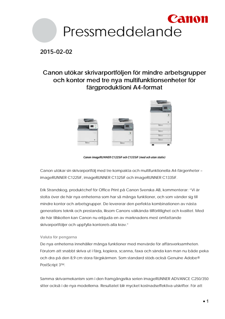 Canon utökar sin skrivarportfölj med tre kompakta och multifunktionella A4 färgenheter – imageRUNNER C1225iF, imageRUNNER C1325iF och imageRUNNER C1335iF.