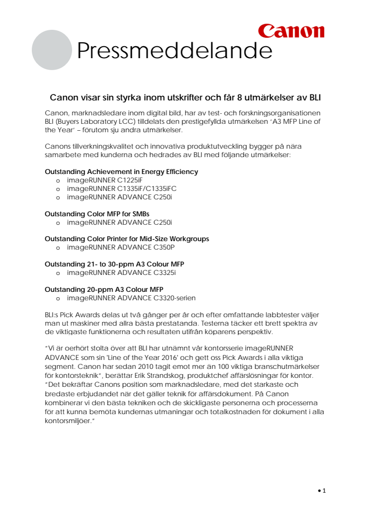 Canon, marknadsledare inom digital bild, har av test- och forskningsorganisationen BLI (Buyers Laboratory LCC) tilldelats den prestigefyllda utmärkelsen ‘A3 MFP Line of the Year’ – förutom sju andra utmärkelser.