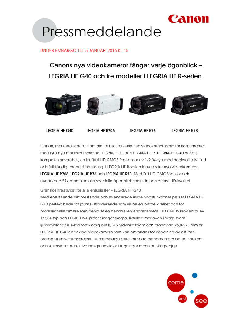Canon, marknadsledare inom digital bild, förstärker sin videokameraserie för konsumenter med fyra nya modeller i serierna LEGRIA HF G och LEGRIA HF R. LEGRIA HF G40 har ett kompakt kamerahus, en kraftfull HD CMOS Pro-sensor av 1/2,84-typ. I LEGRIA HF R-serien lanseras tre nya videokameror: LEGRIA HF R706, LEGRIA HF R76 och LEGRIA HF R78 med Full HD CMOS-sensor och avancerad 57x zoom.