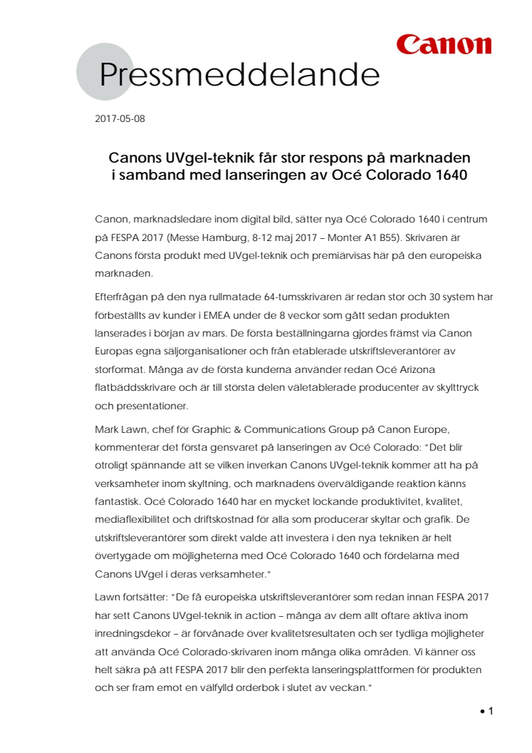 Canon sätter nya Océ Colorado 1640 i centrum på FESPA 2017 (Messe Hamburg, 8-12 maj 2017 – Monter A1 B55). Skrivaren är Canons första produkt med UVgel-teknik och premiärvisas här på den europeiska marknaden.