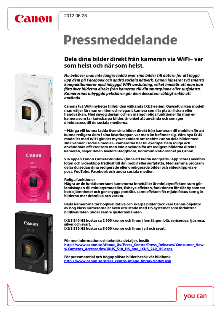 Nu behöver man inte längre ladda över sina bilder till datorn för att lägga upp dem på Facebook och andra sociala nätverk. Canon lanserar två smarta kompaktkameror med inbyggd WiFi-anslutning, vilket innebär att man kan föra över bilderna direkt från kameran till din smartphone eller surfplatta. Kamerornas inbyggda pekskärm gör dem dessutom väldigt enkla att använda.