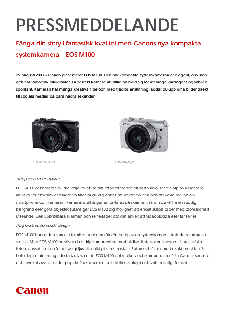 29 augusti 2017 – Canon presenterar EOS M100. Den här kompakta systemkameran är elegant, ansluten och har fantastisk bildkvalitet. En perfekt kamera att alltid ha med sig för att fånga vardagens ögonblick spontant. Kameran har många kreativa filter och med trådlös anslutning laddar du upp dina bilder direkt till sociala medier på bara några sekunder.