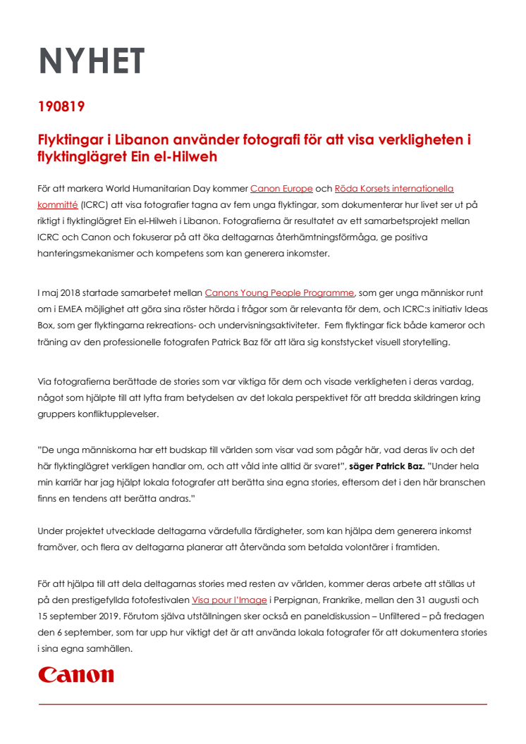För att markera World Humanitarian Day kommer Canon Europe och Röda Korsets internationella kommitté (ICRC) att visa fotografier tagna av fem unga flyktingar, som dokumenterar hur livet ser ut på riktigt i flyktinglägret Ein el-Hilweh i Libanon. Fotografierna är resultatet av ett samarbetsprojekt mellan ICRC och Canon.