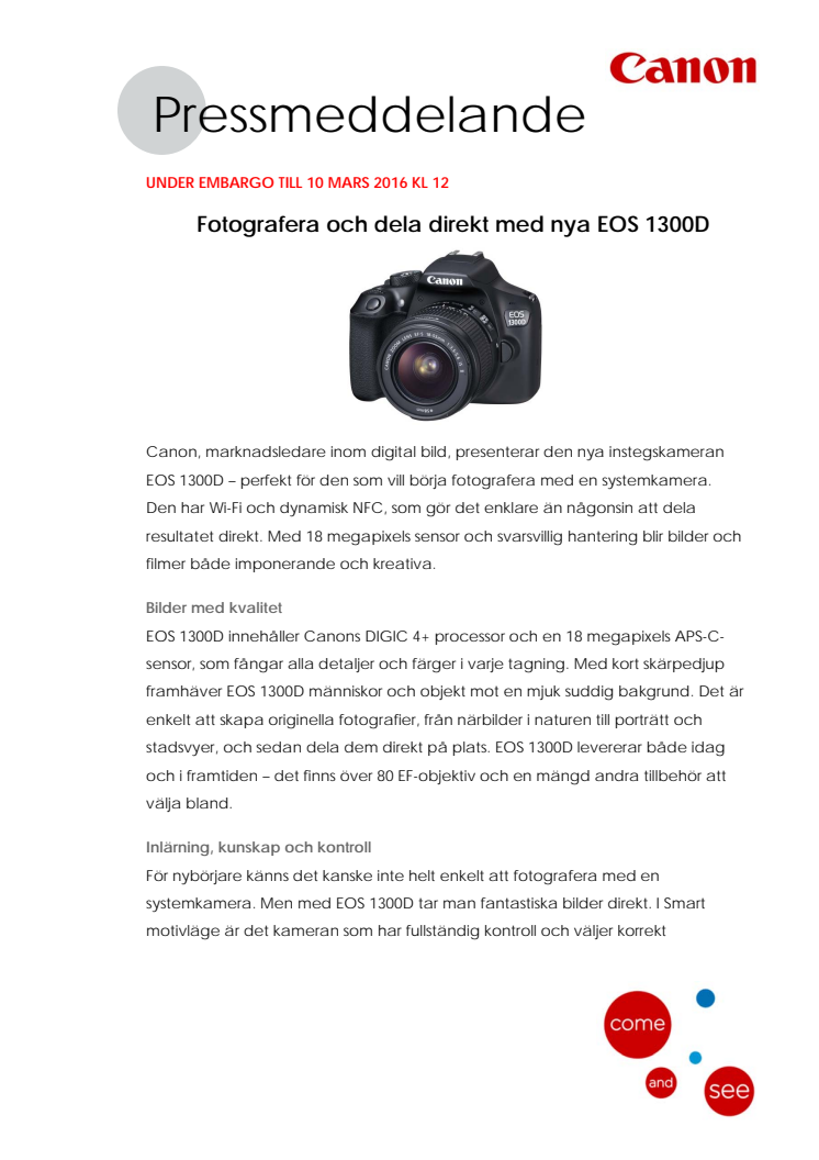 Canon, marknadsledare inom digital bild, presenterar den nya instegskameran EOS 1300D – perfekt för den som vill börja fotografera med en systemkamera. Den har Wi-Fi och dynamisk NFC, som gör det enklare än någonsin att dela resultatet direkt. Med 18 megapixels sensor och svarsvillig hantering blir bilder och filmer både imponerande och kreativa.