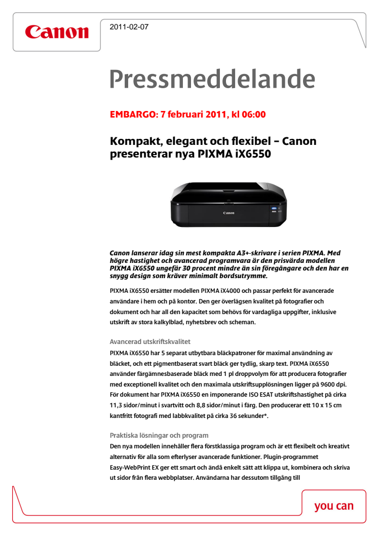 Canon lanserar idag sin mest kompakta A3+-skrivare i serien PIXMA. Med högre hastighet och avancerad programvara är den prisvärda modellen PIXMA iX6550 ungefär 30 procent mindre än sin föregångare och den har en snygg design som kräver minimalt bordsutrymme.