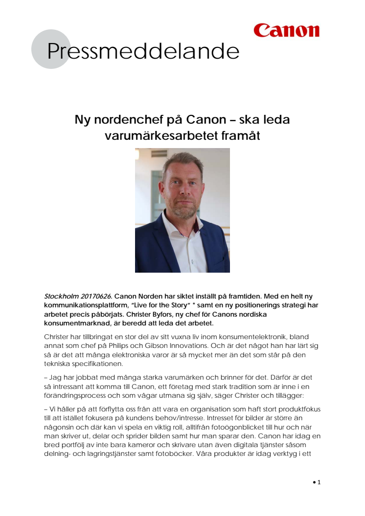 Stockholm 20170626. Canon Norden har siktet inställt på framtiden. Med en helt ny kommunikationsplattform, ”Live for the Story” * samt en ny positionerings strategi har arbetet precis påbörjats. Christer Byfors, ny chef för Canons nordiska konsumentmarknad, är beredd att leda det arbetet.