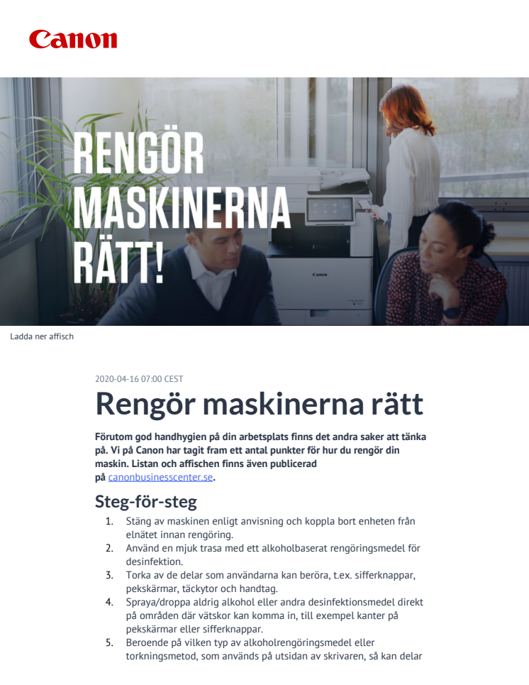 Förutom god handhygien på din arbetsplats finns det andra saker att tänka på. Vi på Canon har tagit fram ett antal punkter för hur du rengör din maskin. Listan och affischen finns även publicerad på canonbusinesscenter.se.