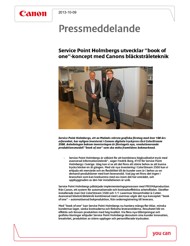 Service Point Holmbergs, ett av Malmös största grafiska företag med över 100 års erfarenhet, har nyligen investerat i Canons digitala tryckpress Océ ColorStream 3500. Anledningen bakom investeringen är företagets nya, revolutionerande produktionsmodell ”book of one” som ska möta framtidens bokmarknad.