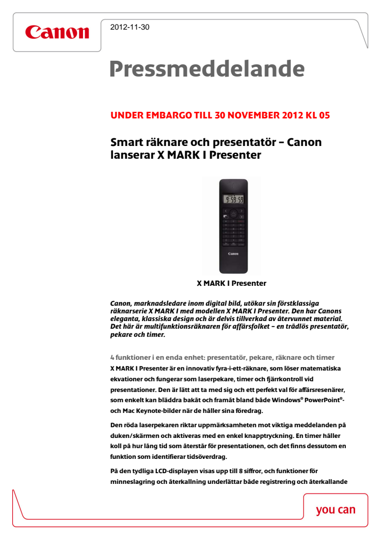 Canon, marknadsledare inom digital bild, utökar sin förstklassiga räknarserie X MARK I med modellen X MARK I Presenter. Den har Canons eleganta, klassiska design och är delvis tillverkad av återvunnet material. Det här är multifunktionsräknaren för affärsfolket – en trådlös presentatör, pekare och timer.