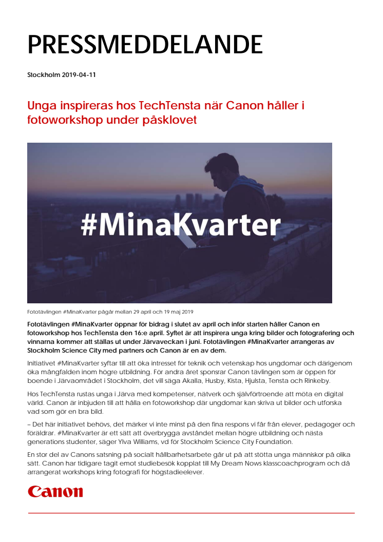Fototävlingen #MinaKvarter öppnar för bidrag i slutet av april och inför starten håller Canon en fotoworkshop hos TechTensta den 16:e april. Syftet är att inspirera unga kring bilder och fotografering och vinnarna kommer att ställas ut under Järvaveckan i juni. Fototävlingen #MinaKvarter arrangeras av Stockholm Science City med partners och Canon är en av dem.