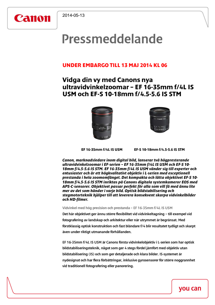 Canon, marknadsledare inom digital bild, lanserar två högpresterande ultravidvinkelzoomar i EF-serien – EF 16-35mm f/4L IS USM och EF-S 10-18mm f/4.5-5.6 IS STM. EF 16-35mm f/4L IS USM vänder sig till experter och entusiaster och är ett högkvalitativt objektiv i L-serien. EF-S 10-18mm f/4.5-5.6 IS STM inriktas på Canons digitala systemkameror EOS med APS-C-sensorer.