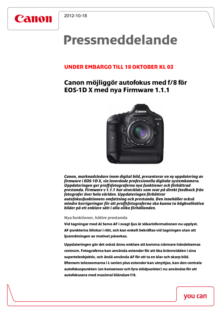 • Canon möjliggör autofokus med f/8 för EOS-1D X med nya Firmware 1.1.1