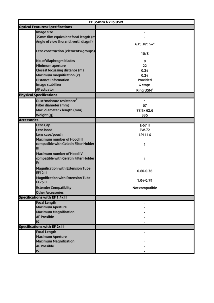 • Canon Tekniska specifikationer EF 35mm f2 IS USM