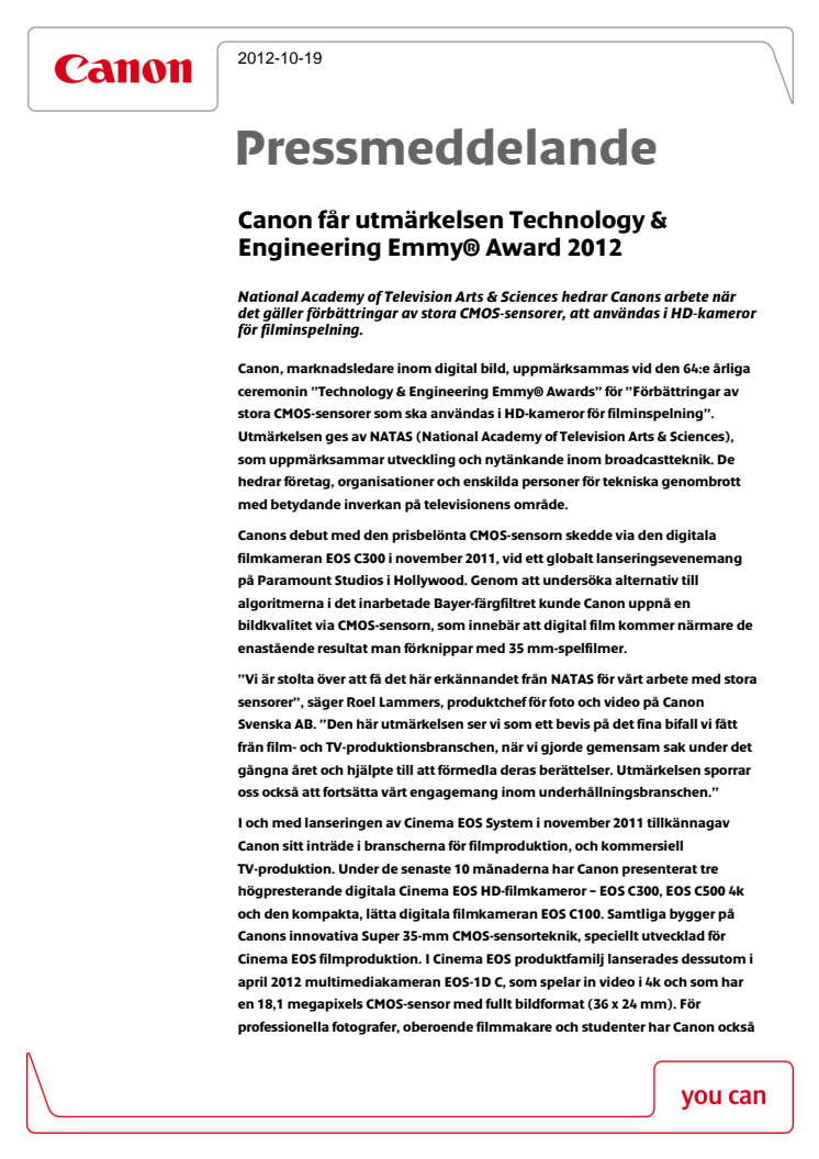 • Canon får utmärkelsen Technology & Engineering Emmy® Award 2012