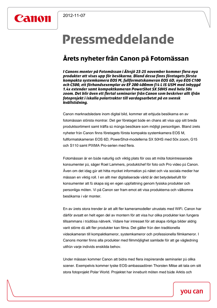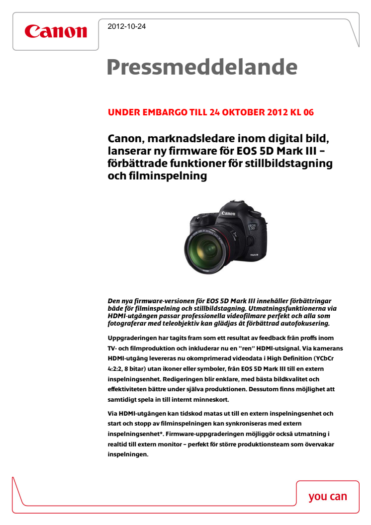 • Canon, marknadsledare inom digital bild, lanserar ny firmware för EOS 5D Mark III – förbättrade funktioner för stillbildstagning och filminspelning